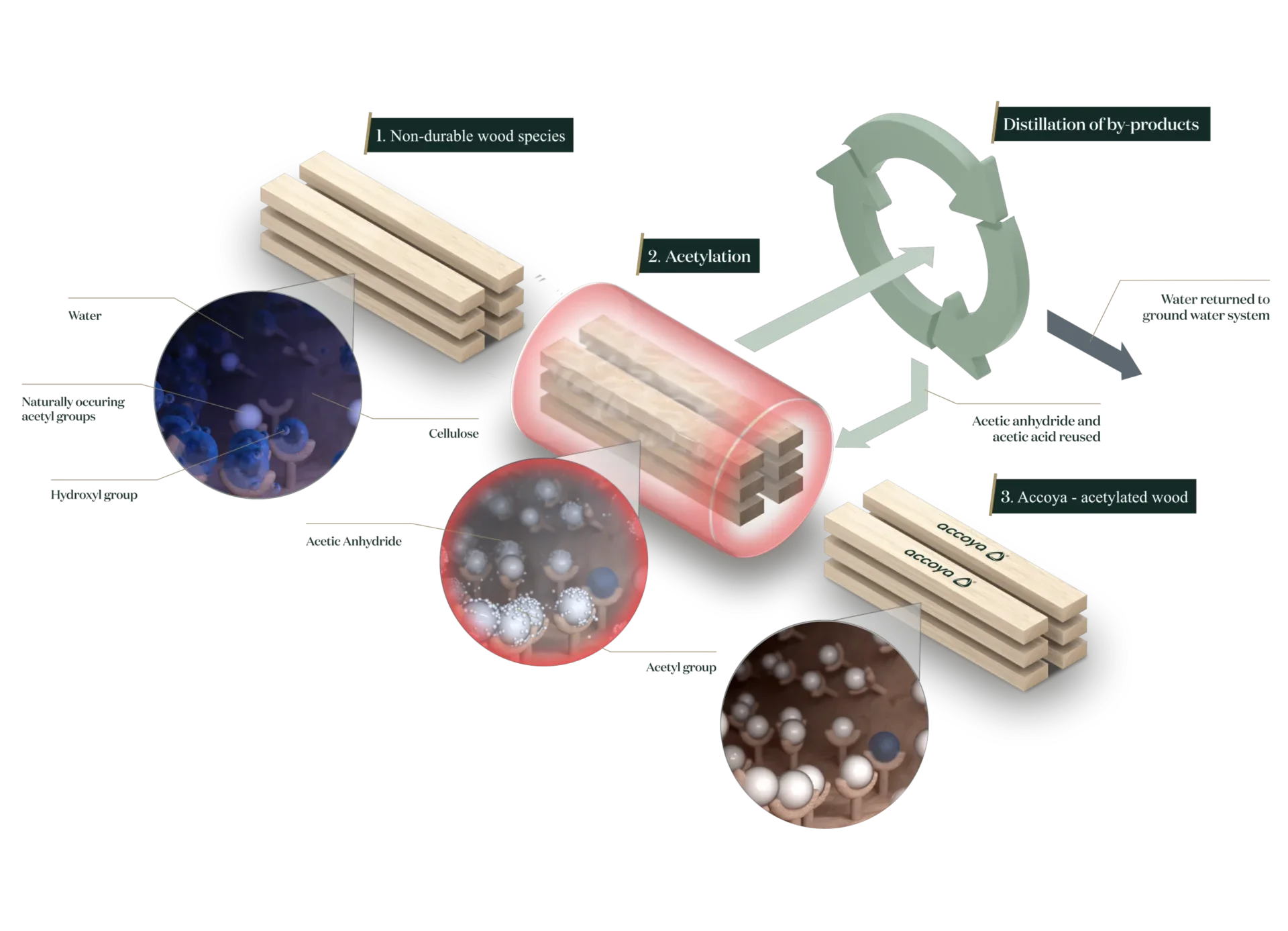 A modification process known as acetylation penetrates into the core of the wood to create a product that is highly stable, resistant to rot, ecologically responsible and uniquely durable. The treatment gives this softwood variety all the desirable characteristics of a hardwood with none of the disadvantages.